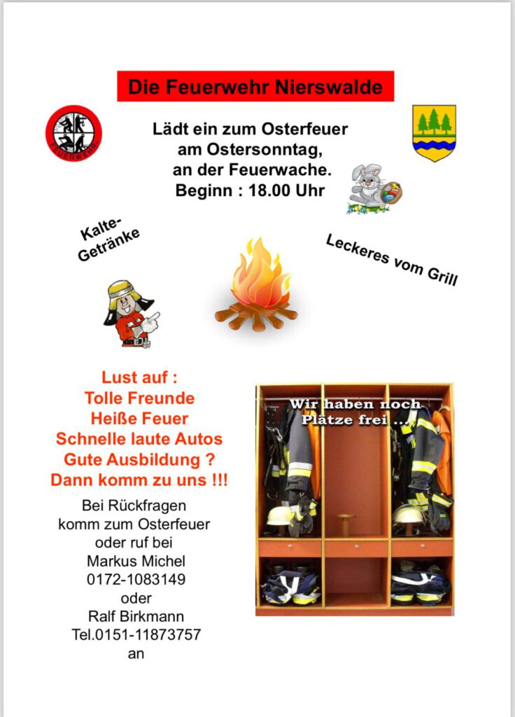 Die Freiwillige Feuerwehr Nierswalde lädt sehr herzlich zum traditionellen Osterfeuer am Ostersonntag 2026 um 18.00 Uhr an die Feuerwache (Dorfstr. 10) ein. Neben Kaltgetränken und leckeren Speisen vom Grill gibt es für die Besucher/innen wieder viele Informationen über die wichtige Arbeit unserer Freiwilligen Feuerwehr für unsere Dorfgemeinschaft.